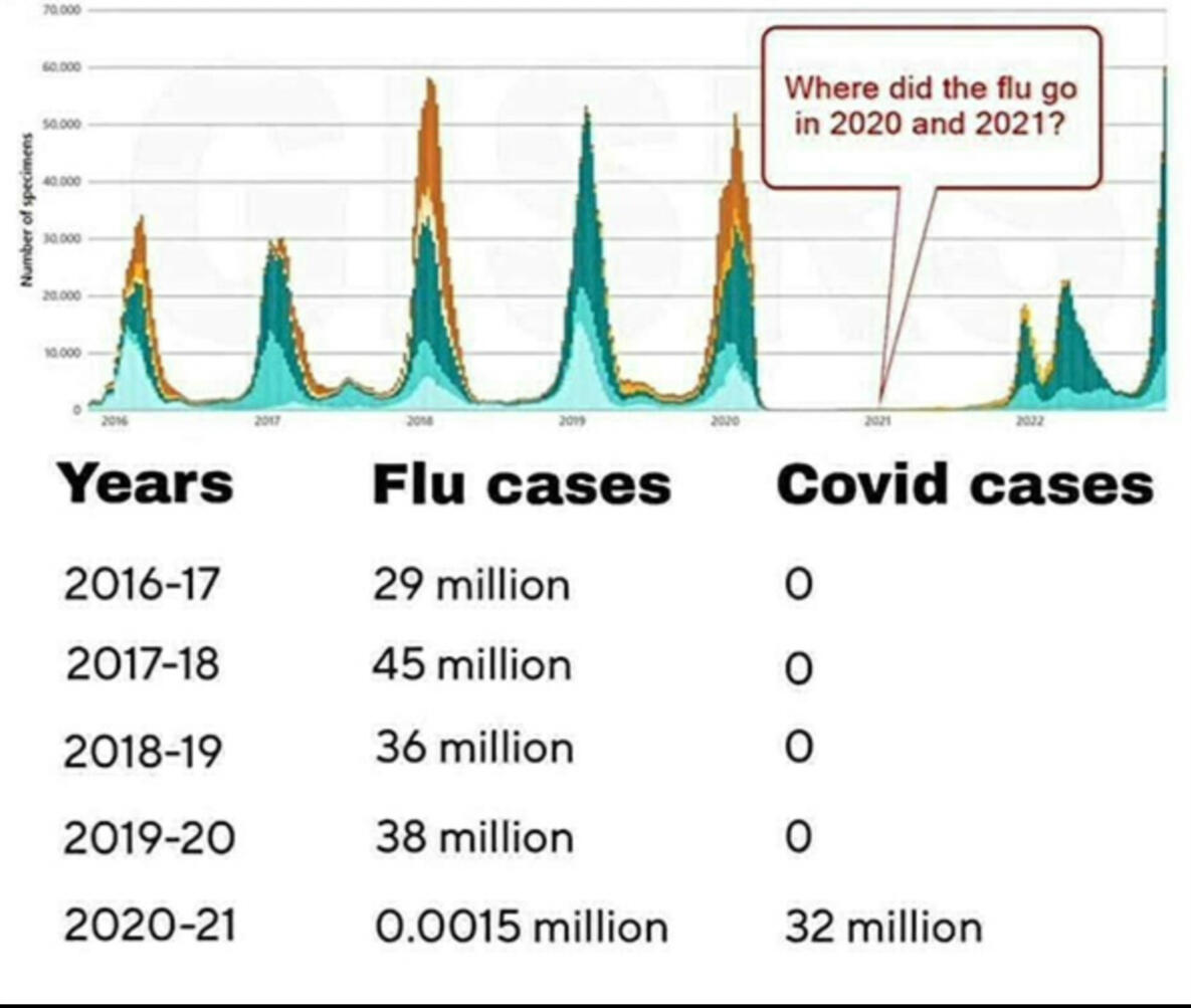 The survival rate for the flu is 99.998%, while the survival rate for Covid-19 is 99.99%. The discussion should end right here. Every sentient being with two brain cells should have, at the very outset, determined the survival rate of this new disease, and along with every media head, politician, doctor, nurse, school principal (the usual sociopaths), should have broadcasted it relentlessly.